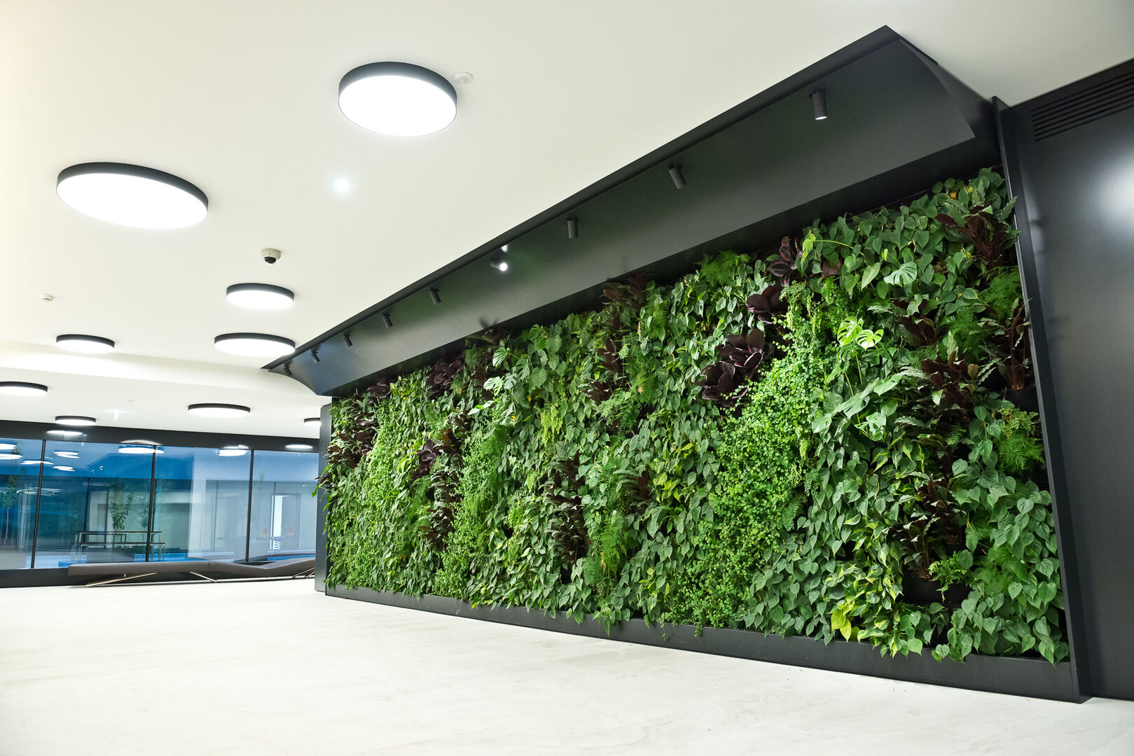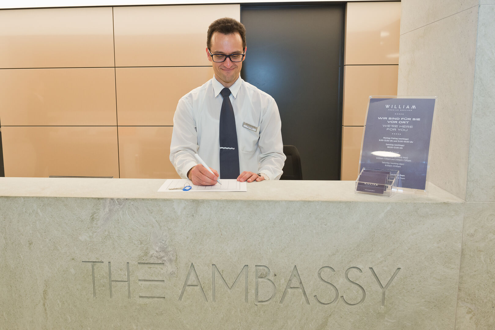Im Eingangsbereich erwarten die Gäste eine begrünte Lobby und der Concierge.