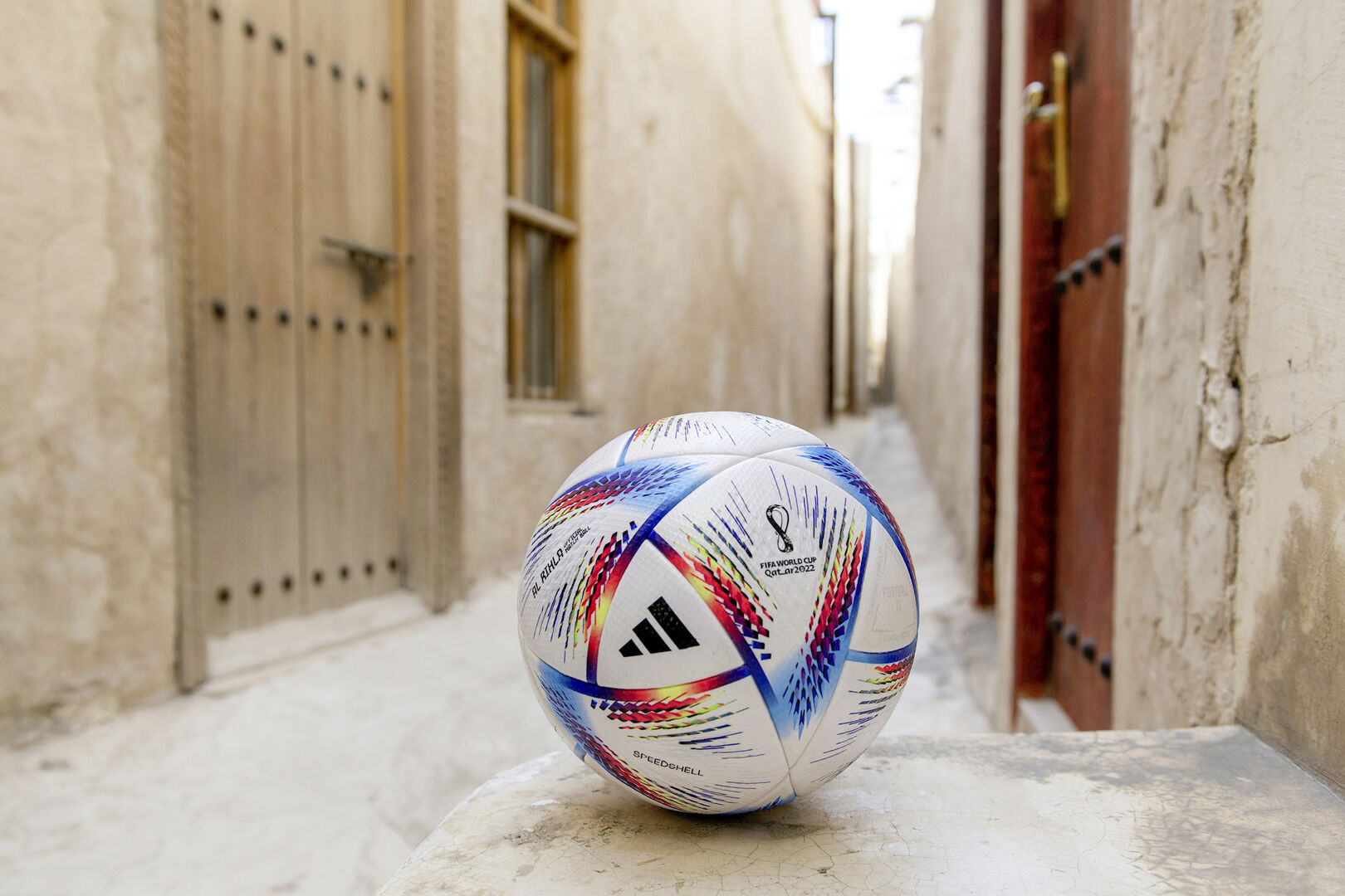 „Al-Rihla“, wie der offizielle WM-Ball heißt, verfügt über eine vernetzte Balltechnologie: Das soll u. a. die halbautomatische Abseitserkennung ermöglichen.
