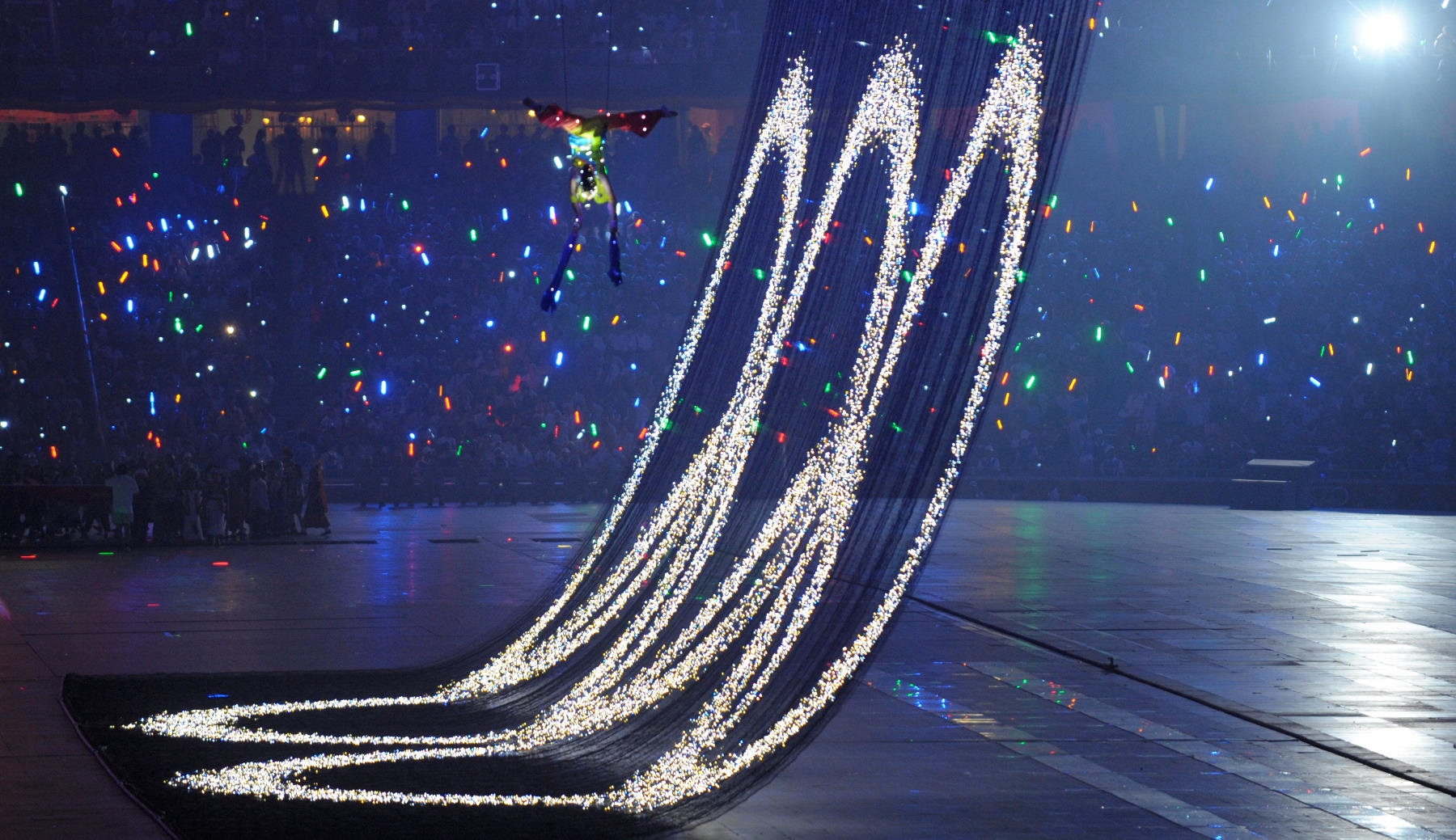Es folgten hunderte konfuzianische Mönche, ganz zu schweigen von den vielen tausend Athleten aus den damals 204 Teilnehmerländern. Ein Schulmädchen "flog" an Leinen über das Stadion, der Turner Li Ning lief eine Runde um das Stadiondach, ehe er die Flamme entzündete.