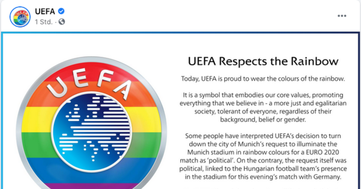 In einem Facebook-Posting hat die UEFA auf die Kritik an der Entscheidung über die Regenbogenbeleuchtung des Münchner Stadions reagiert. Der Verband präsentierte eine neue Version seines Logos das von einem Regenbogen umschlossen wird. Dazu wird erklärt, dass es keine politische Entscheidung war, die Regenbogen-Beleuchtung zu verbieten. Viel mehr sei die Münchner-Anfrage politisch, da es um das Spiel gegen Ungarn geht.