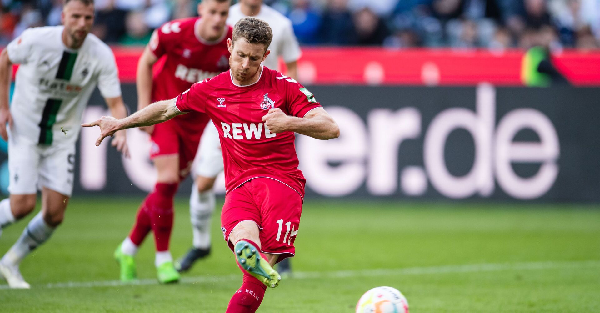 45. Minute: Florian Kainz trifft im Luftduell seinen Gegner, wieder Jonas Hofmann, mit dem Ellbogen. Dummerweise im Strafraum.